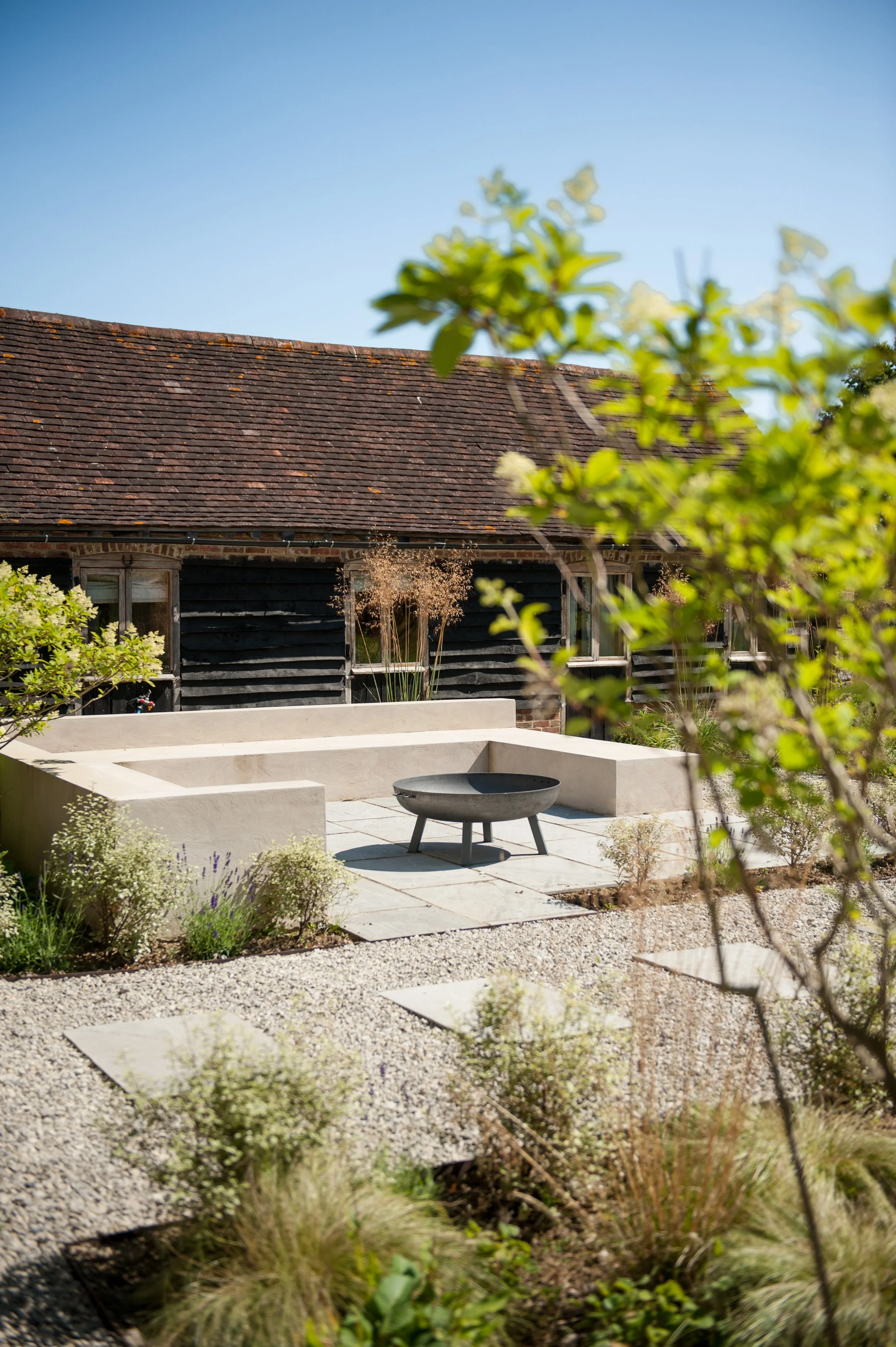This contemporary garden was designed to be in keeping with the contemporary style of the barn. A very large courtyard, broken up into sections for entertaining, with a large bespoke water feature.