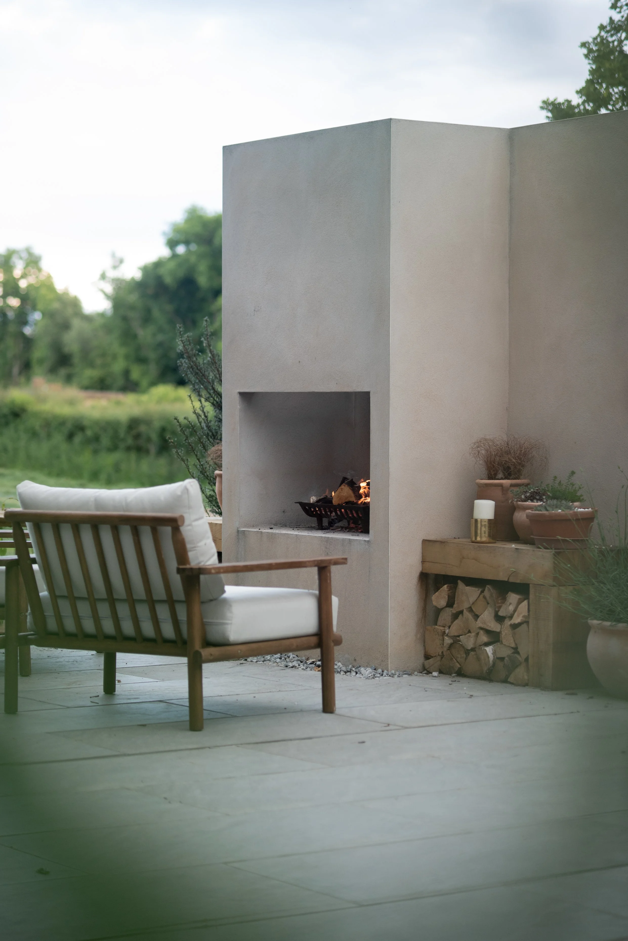 A large, sociable family, we created an outside studio for extra accommodation, a bespoke pergola and fire place, clay paver paths to break up the limestone paving an outdoor kitchen as well as a fire gas fire pit on the drinks terrace.
