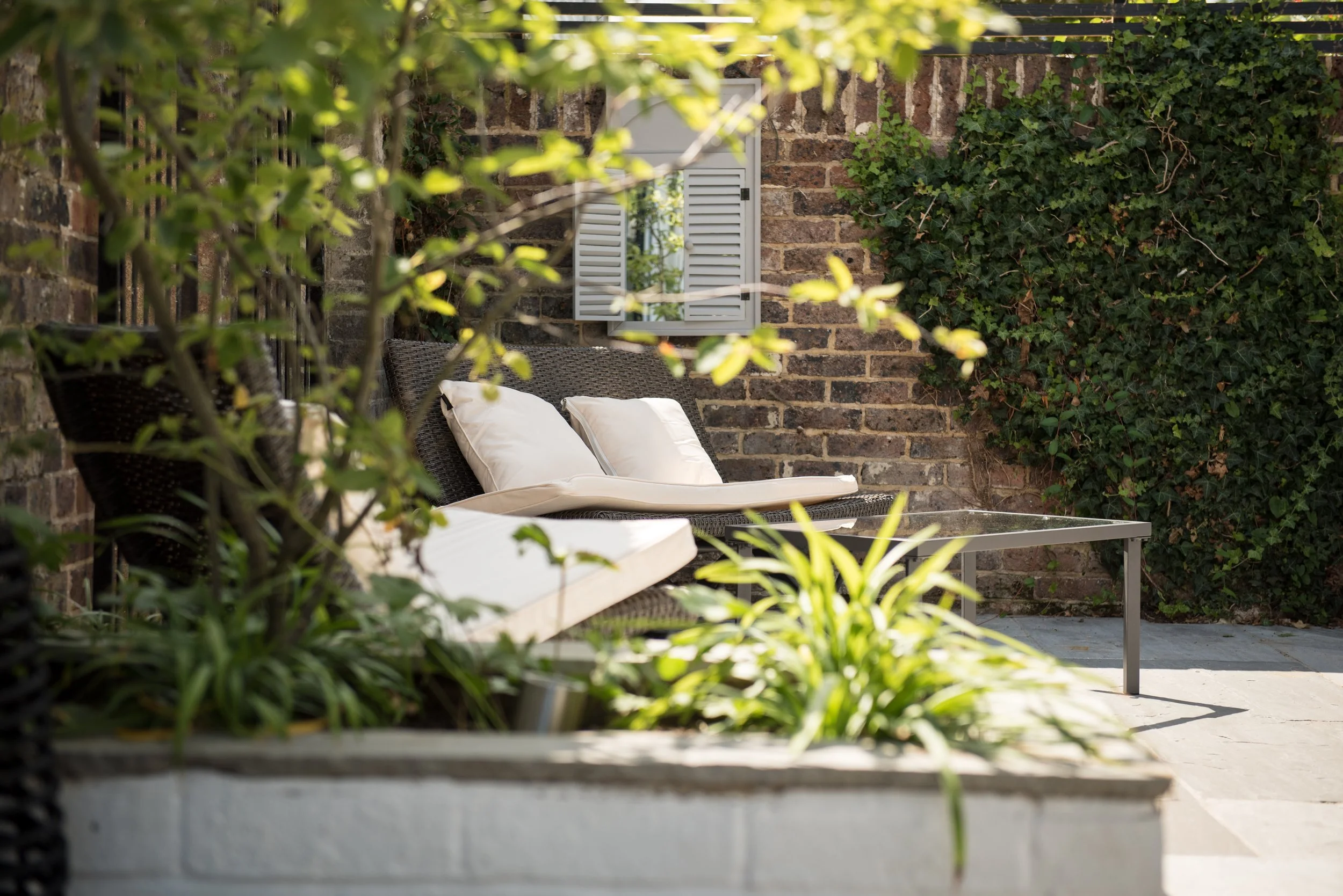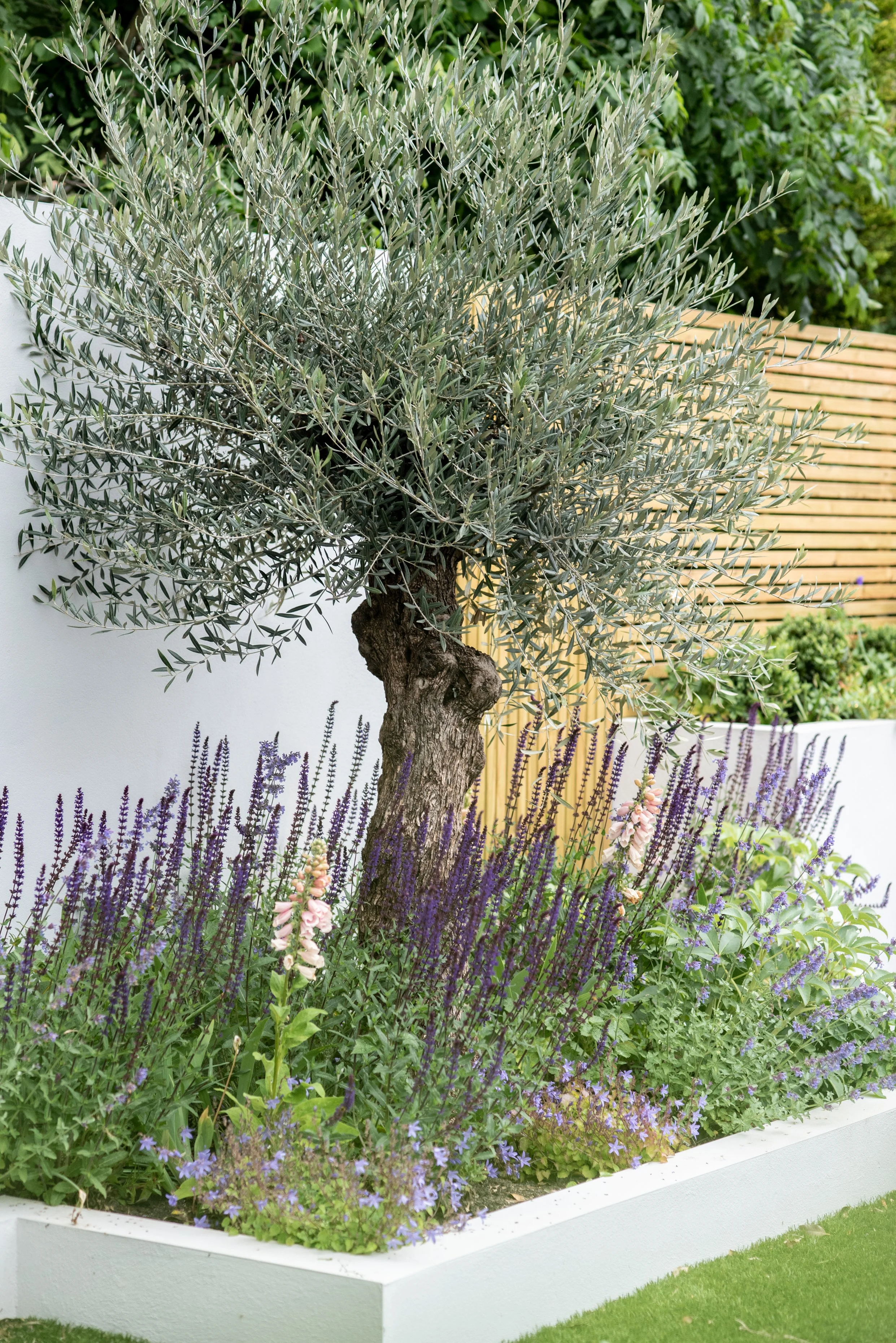 This client wanted a low maintenance garden that looks striking from within their kitchen. We added raised, rendered planters to lift the plants behind their cube spa and sofa area. We created a feature wall to help frame the large, gnarly Olive tree. We designed the fencing to change direction to add additional weight to this focal point. Finally we added a small built in BBQ and dinning area.