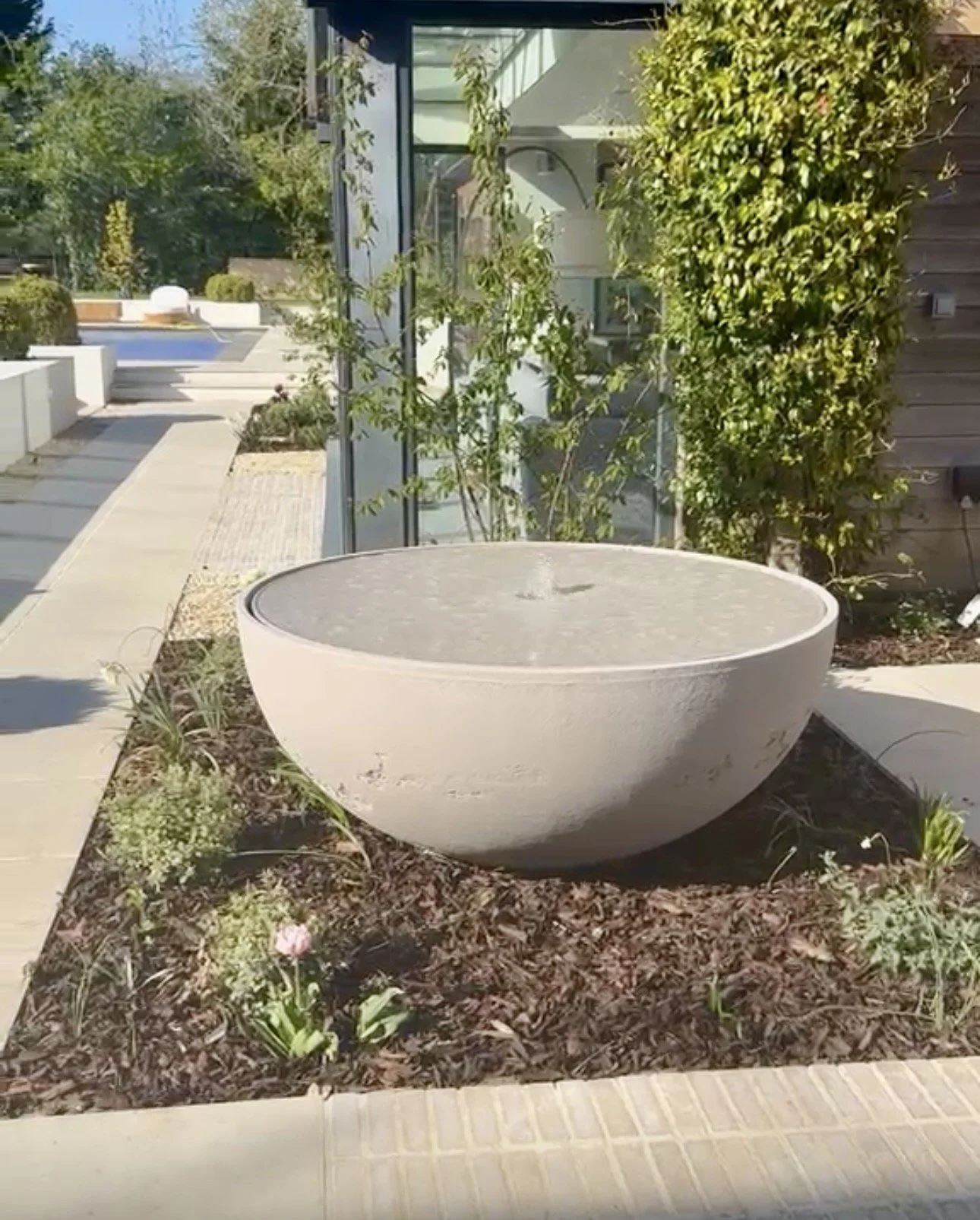 A beautiful house and garden. We added water feature, sauna and ice bath, various seating areas, floating benches, a beautiful stone bench and stunning furniture throughout this garden. At the front we updated the planting, added a central island to prevent parking up to the front door, we also added parking bays to help guide visitors where to park.