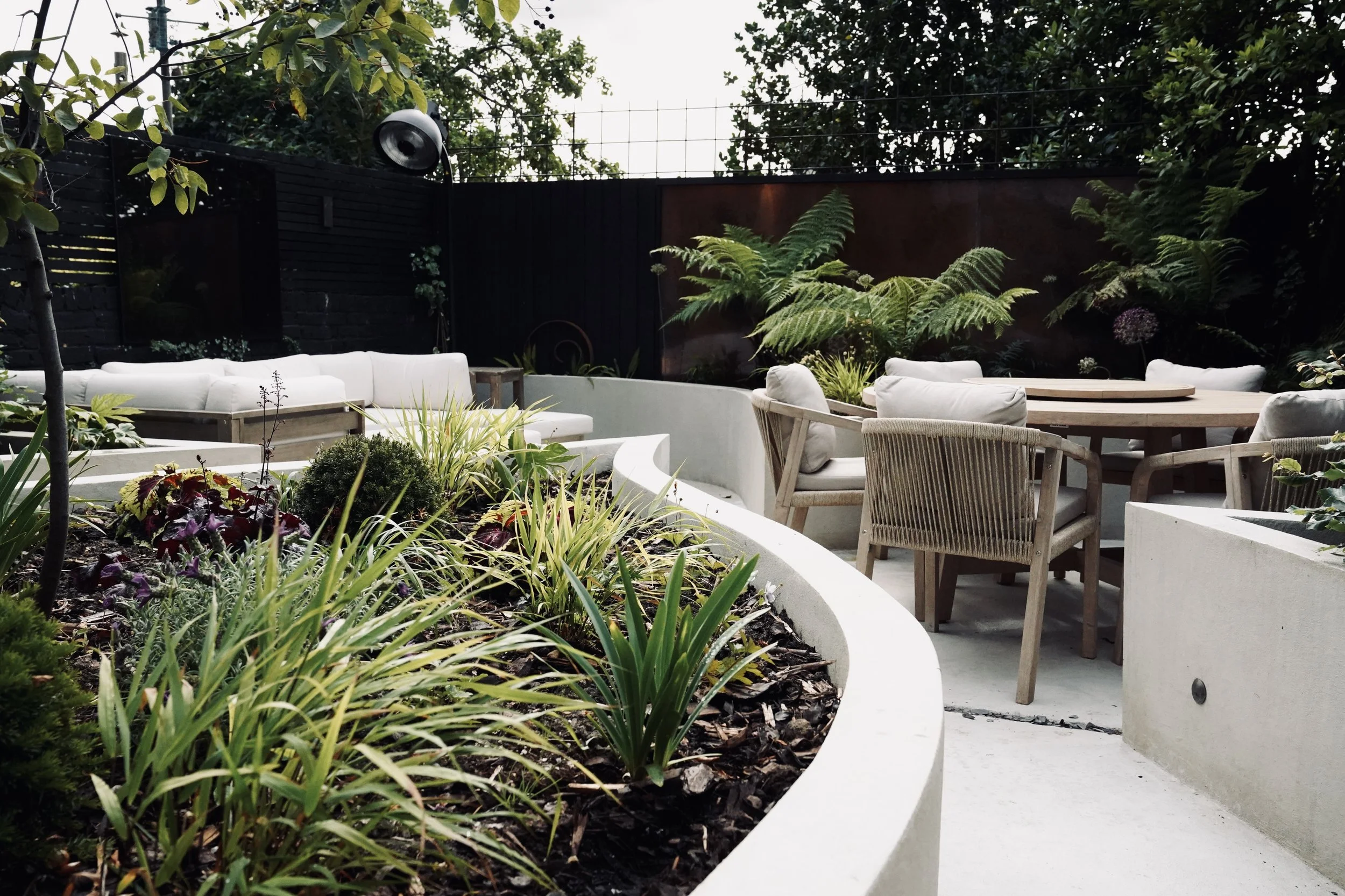 A garden build with microcement and a copper feature wall, creating a unique and elegant garden. The raised planters are bench height, creating division between areas and additional seating.